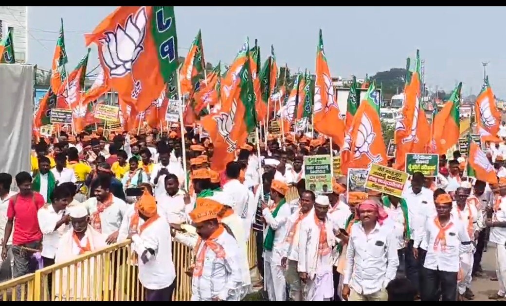 ಬೆಳೆ ಪರಿಹಾರ ನೀಡಿಕೆ ಹಾಗೂ ರೈತರ ಸಾಲ ಮನ್ನಾ ಮಾಡುವಂತೆ ಆಗ್ರಹಿಸಿ ನಡೆದ ಬೃಹತ್ ಪ್ರತಿಭಟನೆಯಲ್ಲಿ ಔರಾದ್ ಎಪಿಎಂಸಿ ಸರ್ಕಲ್ನಿಂದ ಗಾಂಧಿ ಬಸವೇಶ್ವರ ವೃತ್ತದವರೆಗೆ ರ್ಯಾಲಿ. ಹಾಳಾದ ಬೆಳೆ ತಲೆ ಮೇಲೆ ಹೊತ್ತುಕೊಂಡು ರಾಜ್ಯ ಸರಕಾದ ವಿರುದ್ಧ ಚವ್ಹಾಣ ಅವರು ಆಕ್ರೋಶ ವ್ಯಕ್ತಪಡಿಸಿದರು.